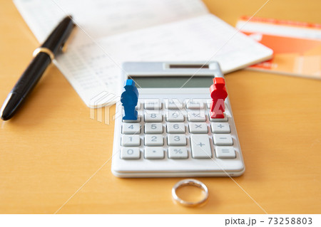 結婚指輪と通帳と電卓 お金イメージ