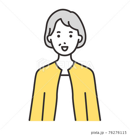 正面向き。腕をおろすカーディガンを着た高齢女性。
