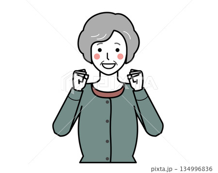正面向き。ガッツポーズをするカーディガンを着た高齢女性。