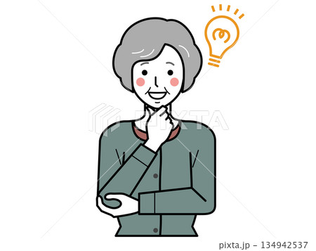 正面向き。あごに手をあて、ひらめき顔のカーディガンを着た高齢女性。