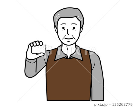 正面向き。カードを持つシャツとベストを着た高齢男性。