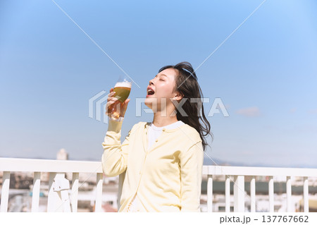 青空の下でビールを楽しむ若い女性