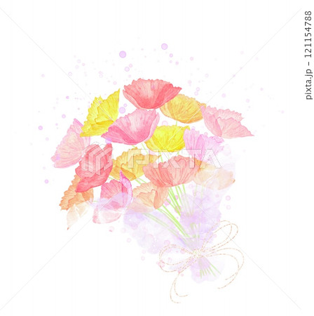 カラフルなポピーの花束の水彩イラスト。華やかな雰囲気で幸福感溢れる画像。