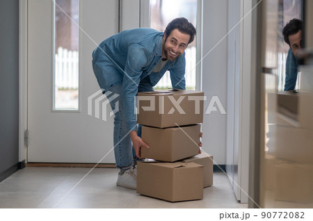 Man bending over with boxes smiling to side