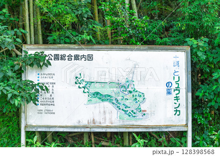 (看板・地図)夏の光芒に映える幸福神社(岡留稲荷神社)と岡留公園広場風景(球磨郡あさぎり町)