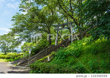(鳥居)夏の光芒に映える幸福神社(岡留稲荷神社)と岡留公園広場風景(球磨郡あさぎり町)