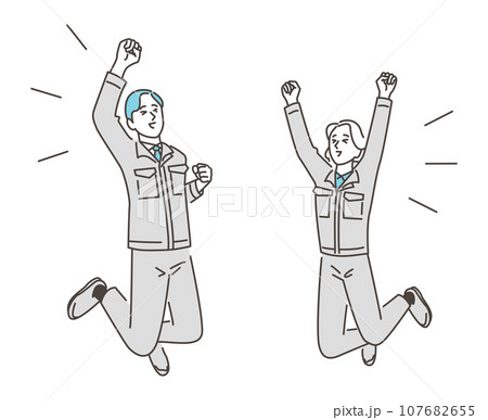 喜ぶ男女作業員がジャンプしてガッツポーズ【ベクターイラスト素材】