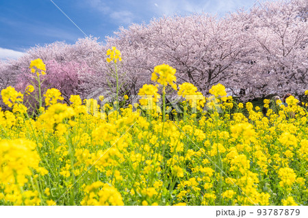 【埼玉県】晴天の権現堂桜堤の満開の桜と菜の花