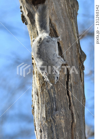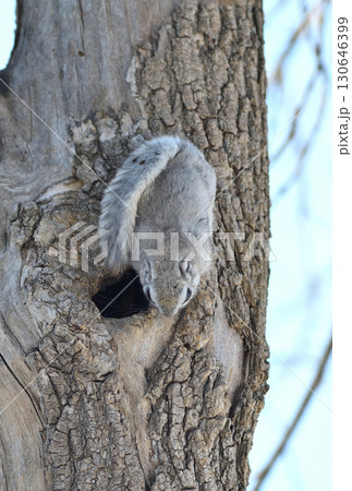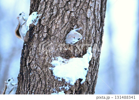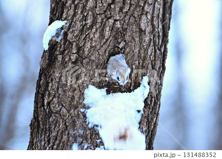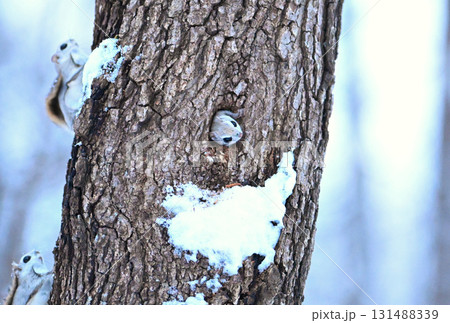 北海道の冬の公園で日中に巣穴の樹洞から出るエゾモモンガ