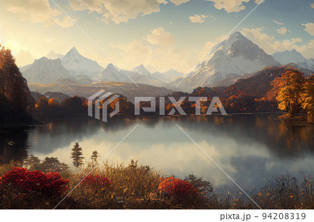 油絵風タッチの幻想的な山と湖の風景