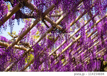 紫色の藤が垂れ下がる幻想的な藤棚の風景