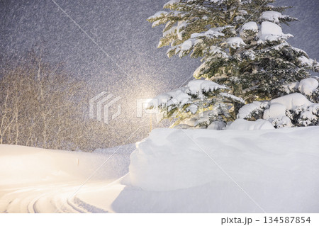 Winter town landscape. Vector Christmas night countryside scene with decorated snowy cottages and frosted trees under full moon and falling snowflakes, create tranquil serene, magical holiday ambiance