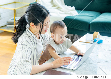 赤ちゃんを抱っこしながらパソコンで話す主婦