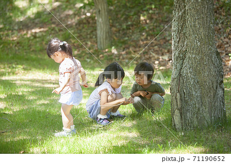 木漏れ日の中で虫を探す子供達