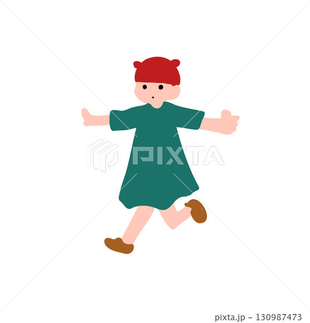 赤いお団子ヘアの子どもが走る手書きベクターイラスト