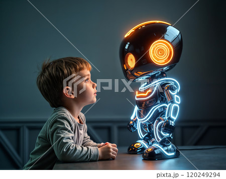 A child interacts with a futuristic robot in a softly lit room, showcasing a moment of curiosity and wonder during a quiet afternoon