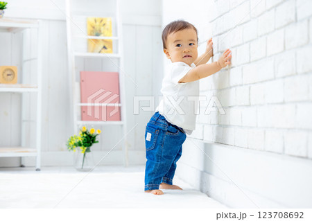 手押し車 歩く練習をする笑顔の赤ちゃん