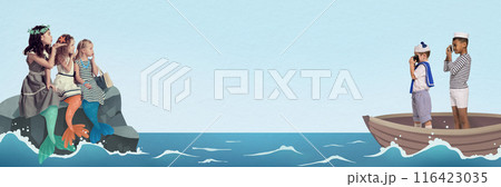 Three mermaid girls sit on rock, while two boys in sailor outfits looking at them from boat with binoculars. Imagination. Contemporary art collage