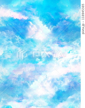 パステルカラーの入道雲の神秘的な天国背景イラスト(縦構図)