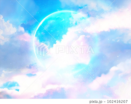 青く輝く満月と虹色に漂う雲海の宇宙空間背景イラスト