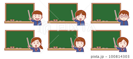 黒板の前で指示棒を持って説明する学生たち