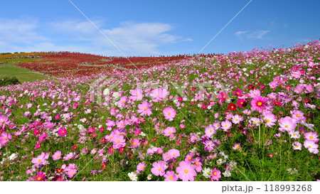秋 国営ひたち海浜公園の満開コスモスと紅葉コキア広大な丘を彩る