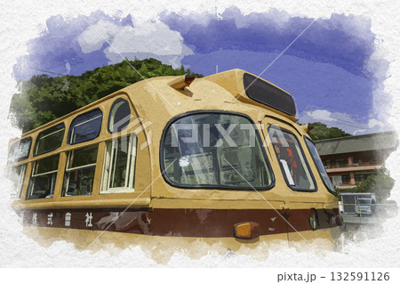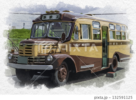 水彩画風 ボンネットバス 鞆鉄道 広島県福山市