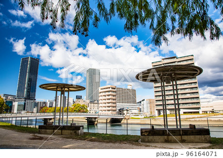 段原町の猿猴川緑地から広島駅前のビッグフロントビル方面を展望しています。前方の橋は大正橋です。