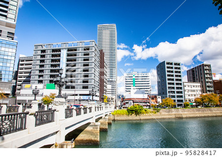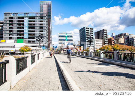 西蟹屋町と的場町に架かる大正橋から広島駅前通りのビッグフロントビル方面を展望しています。広島県