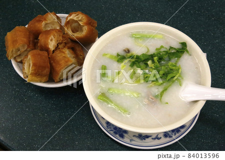 香港の広東風の粥。奥は油条と呼ばれる揚げパン