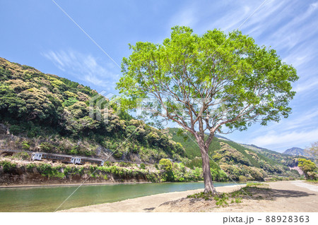 宮崎県日南市北郷町広渡川河川に育つ大きな1本樹の下を走る様な対岸のJR日南線ローカル列車キハ40