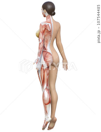 女性の筋肉解剖図のイラスト 3Dモデルの全身後ろ姿