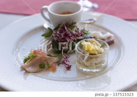 酒田市のフレンチレストランで提供された旬の前菜三点盛(3月上旬・地元食材)