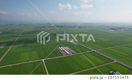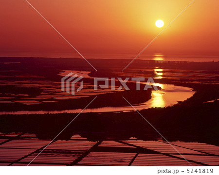 山形県酒田市芹田 庄内平野の一面の水田と沈む夕日