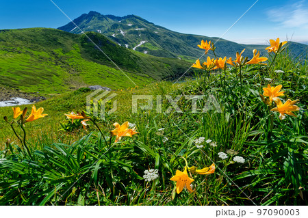 鳥海山・御浜付近のニッコウキスゲ群落と日本海の眺め