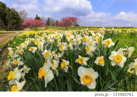 国営備北丘陵公園の春景色桜と水仙と青空