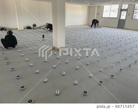 事務所の床下地のOAフロアの施工風景