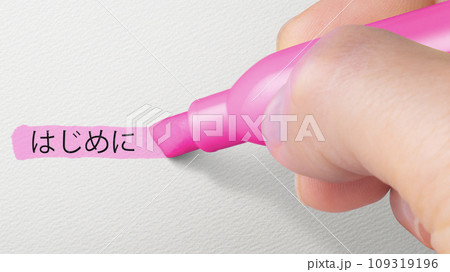 はじめに、の単語に蛍光マーカーでピンク色のラインを引いている手