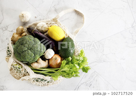 A reusable shopping string bag with vegetables and fruit from the supermarket. Single-use plastic bag ban concept. Zero waste background. High quality photo