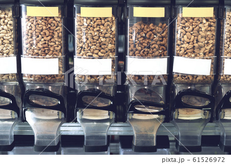 Dispensers with nuts in zero waste shop. New trend alternative buying.