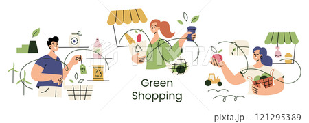 Set of vector illustrations, green shopping collection, people with eco products at local markets and supermarkets. Reusable bags, fresh organic fruits, and vegetables in flat cartoon style
