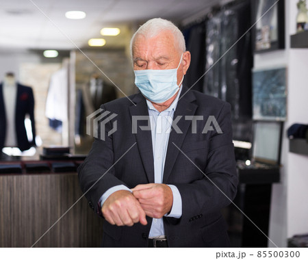 Senior customer in protective mask trying on a fashion jacket in men's boutique