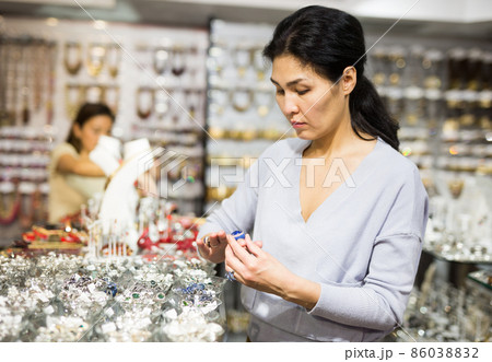 Smiling woman customer deciding on make-up items in cosmetics shop