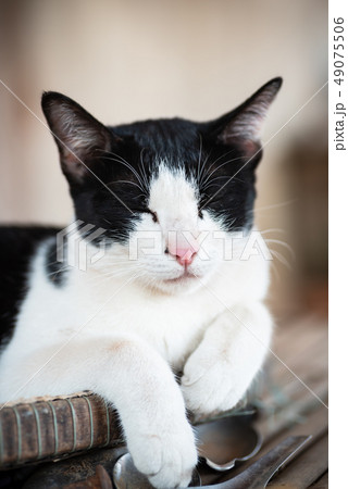 里山の物置小屋の中で見つめる猫の長閑な光景