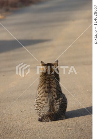 里山の道路に座って見つめるキジトラ猫の後ろ姿