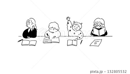 手書き風の子どもたちの勉強イラスト/教室・学習・読書・授業風景