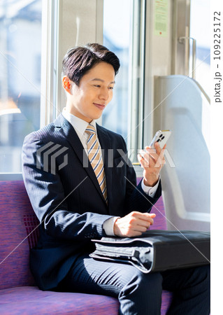 通勤でスマホを見るミドルのビジネスマン 撮影協力「京王電鉄株式会社」