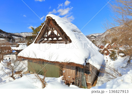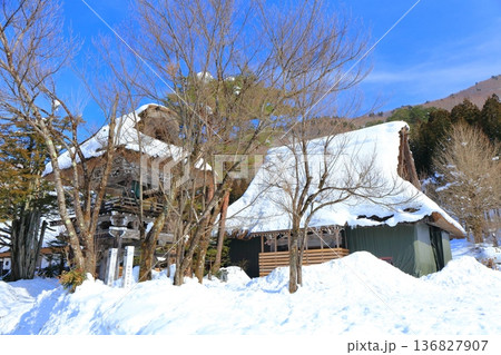 【岐阜県】快晴の白川郷の明善寺庫裡の雪景色(明善寺郷土館)