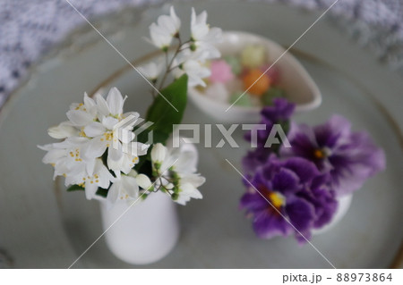 テーブルにヒメウツギ、フリルパンジーを飾る