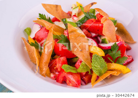The fresh vegetables salad seasoned with juicy